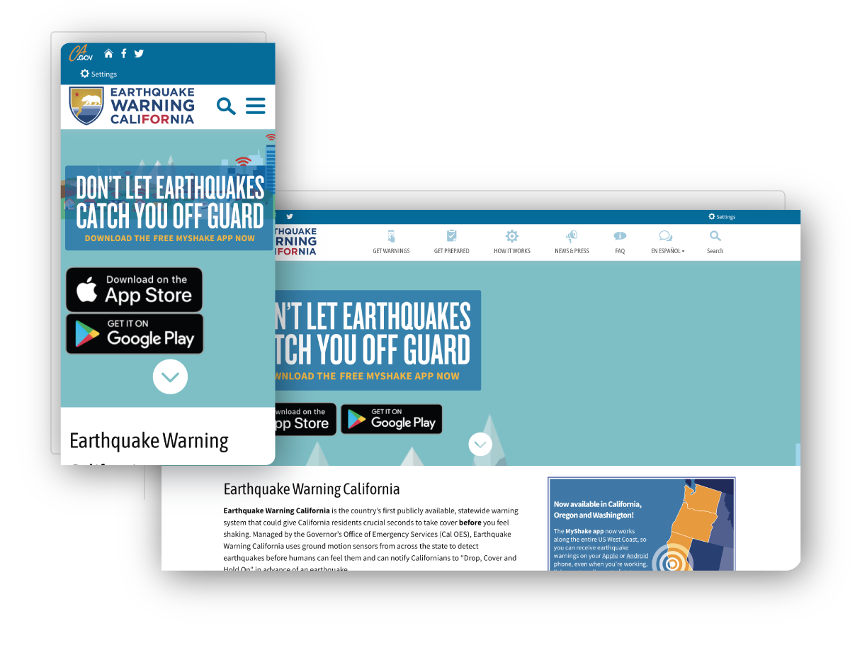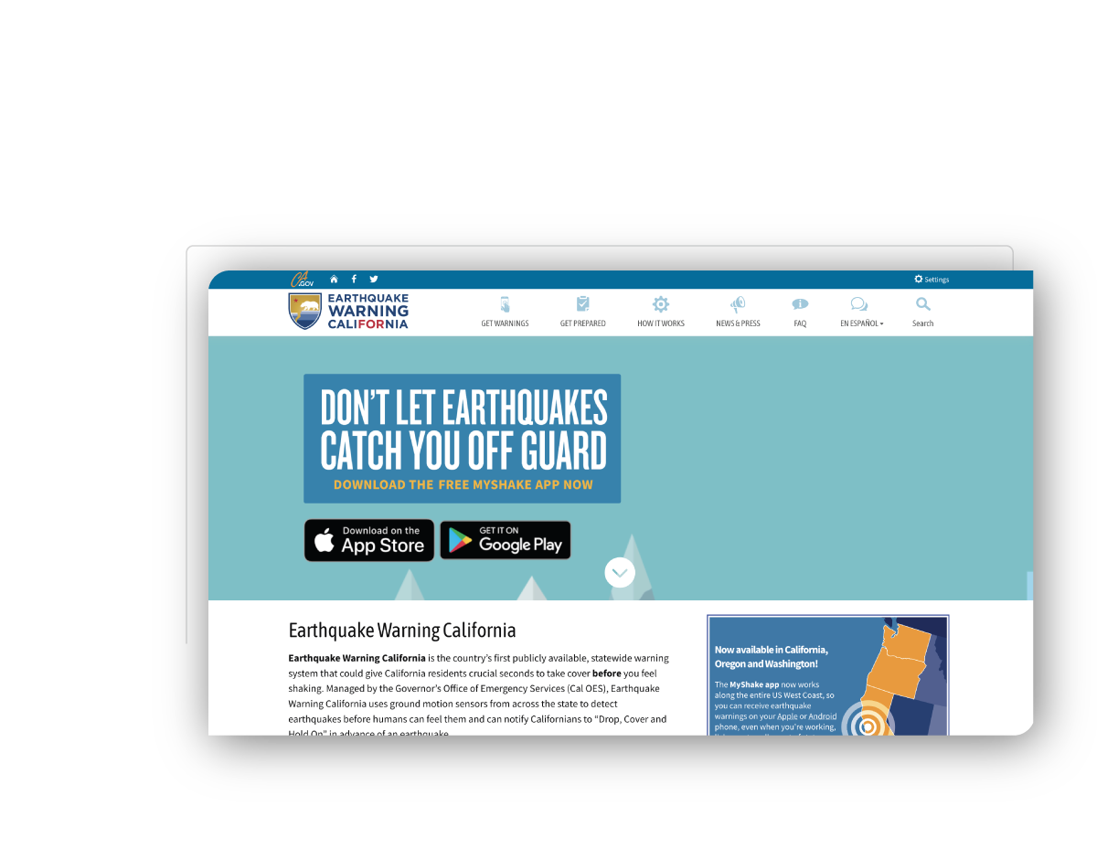 Earthquake Warning California is the country’s first publicly available, statewide warning system that could give California residents crucial seconds to take cover before you feel shaking. Managed by the Governor’s Office of Emergency Services (Cal OES), Earthquake Warning California uses ground motion sensors from across the state to detect earthquakes before humans can feel them and can notify Californians to “Drop, Cover and Hold On” in advance of an earthquake. Bonfire designed and built this custom website to share critical information with the residents of California to help keep them safe in case of an earthquake.